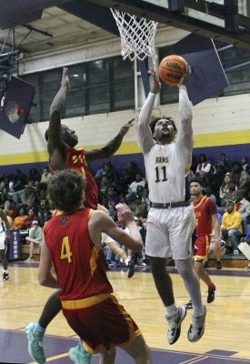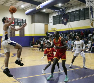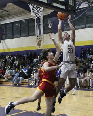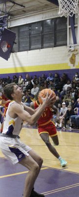 Gavin Jenkins (right) goes up for a basket. Photo by Cliff Smelley.