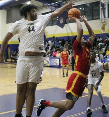 Thomas Williams (right) shoots over a Baker County player. Photo by Cliff Smelley.