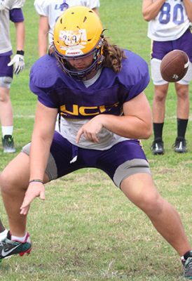 One of the tasks for the offensive line is to protect a new quarterback. Three players are in the mix: Jeffrey Brugh, a senior baseball player who’s in his first year on the football team, senior Cash Cox and freshman Cadenz Merriex.