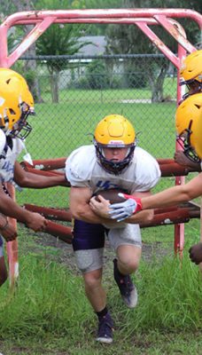 Wyatt Elixson (center) runs through a gauntlet at practice.