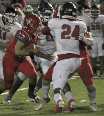 A fumble on a lateral gave Baldwin the ball at the Bradford 20-yard line early in the second quarter. Two plays later, the Indians were facing third-and-12. Chason Clark sacked Indians quarterback Jalen Hitchens for a 7-yard loss. Baldwin went for it on fourth down, with Chalil Cummings intercepting a pass. His return, plus a Baldwin penalty, put the Bradford offense at midfield.