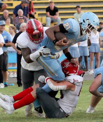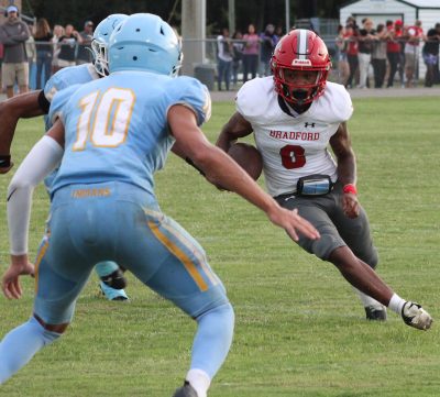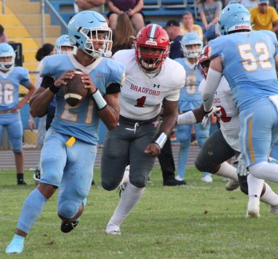 Chiefland’s offense was able to pick up two first downs on the ensuing drives, the second of which was a 10-yard run by Adams to the Bradford 40. The Tornadoes’ Damarion Hankerson stopped Jones for no gain on a run play, but Adams completed a 7-yard pass to set up third-and-3. Adams carried the ball two straight times, gaining only 2 yards and resulting in a turnover on downs at the Bradford 31.