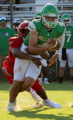 39. Jeremiah McKenzie entered the game at quarterback and ran for a 13-yard gain, followed by a 5-yard run by Addison. Iyen Addison then broke through several tackles on a 21-yard touchdown run that put Bradford up 6-3 with 56 seconds left in the first quarter. Paulk’s pass on the conversion attempt was incomplete.
