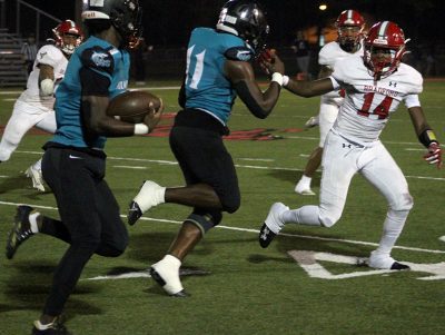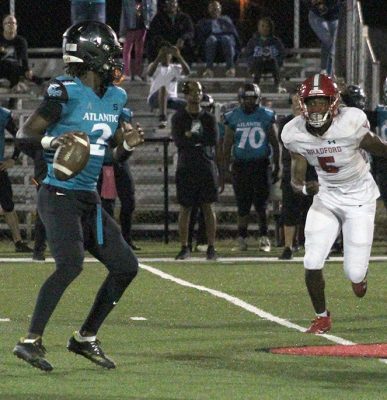 Atlantic’s offense was again able to gain a first down, but a penalty and a 6-yard sack by the Tornadoes’ Torin Brazell forced the Sharks to punt. This time, Atlantic was able to get a successful kick off, with Bradford taking over at its own 32-yard line.