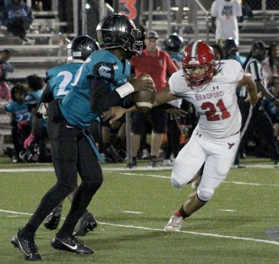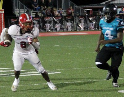 Atlantic, the region’s eighth seed, had a third-and-2 play on the game’s first series, but Bradford’s Chason Clark tackled Kwasie Kwaku for a 1-yard loss. After a penalty for delay of game, the Sharks committed a fumble on a punt attempt. The Tornadoes’ Jeremiah McKenzie recovered the loose ball at the Atlantic 35-yard line.