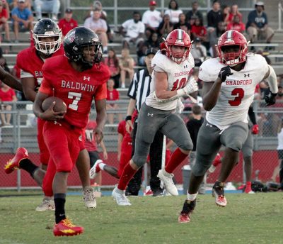 Baldwin’s lone score came when Bradford was forced to punt following its second possession of the half. The low punt hit an offensive lineman. The Indians’ Leon Kirkland scooped up the ball and returned it approximately 20 yards for a touchdown and a 28-6 score. The extra point was no good.