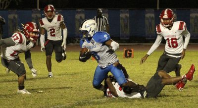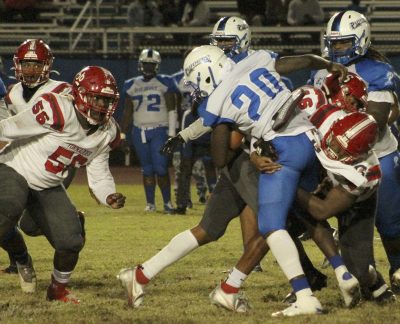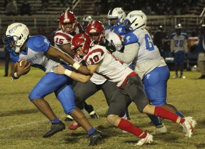 Torin Brazell (far right), with teammate Jeremiah McKenzie behind him, wraps up Pahokee’s Torian Henley. Trente Jenkins (far left) arrives to help finish the tackle. Photo by Cliff Smelley.