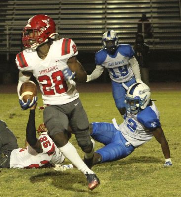 Starting from their own 25, the Tornadoes promptly picked up a first down on Tez Williams’ 10-yard reception. Two plays later, Cummings caught a 12-yard pass for a first down at the 48-yard line. An incomplete pass, after two Jones runs, had Bradford facing fourth-and-5 at the Pahokee 47. The Tornadoes went for it, with Cummings using his strength against a Pahokee defensive back to go up and pull down a pass from Jones for a first down at the 25. An 18-yard run by Covey set up his own 7-yard touchdown run at the 8:17 mark of the second quarter. Hughes added the PAT as the Tornadoes took a 14-7 lead.