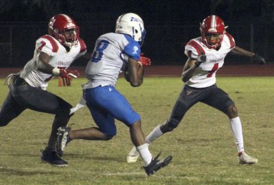 Sincere Hankerson (far left) and Jametrius Pringle (far right) converge on Pahokee receiver Maurice Collier. Photo by Cliff Smelley.