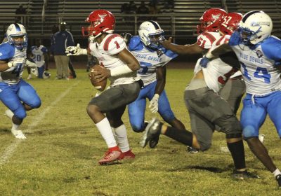 Lineman Jorden Daniels (left, background) grapples with a Pahokee defender as quarterback Amari Jones gets off a pass. Photo by Cliff Smelley.