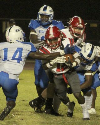 Chason Clark (right) attempts to slow down Pahokee running back Micah Steele. Bradford’s Torin Brazell (background, far left) and Trente Jenkins (background, center) are also pictured. Photo by Cliff Smelley.