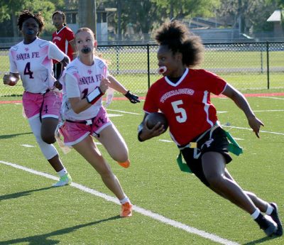 Santa Fe’s offense went three-and-out on its first drive, which consisted of two incomplete passes and one completed pass for only a 2-yard gain, thanks to a flag pull by Davis.