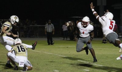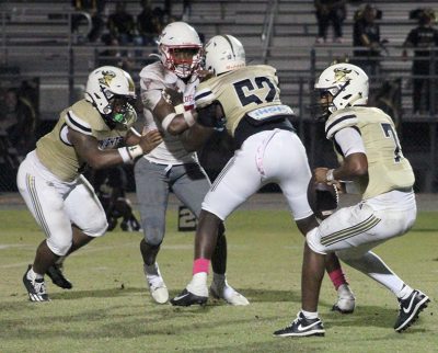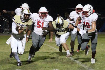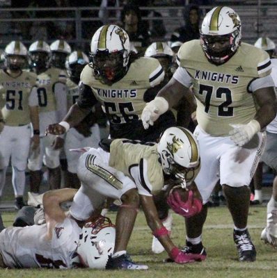 The Tornadoes’ first defensive play following the ensuing kickoff was a tackle for no gain by Trente Jenkins and Devon McBride. Chason Clark then held Oakleaf running back Chris Foy to a 3-yard gain. The Knights did pick up 5 yards on a pass play before punting on fourth-and-2.