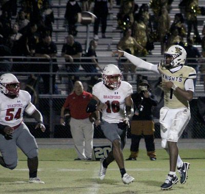 Oakleaf’s Michael Conner returned the ensuing kickoff 66 yards to the Bradford 18-yard line. A facemask penalty two plays later gave the Knights first-and-goal at the 6. A 6-yard sack by Clark on second down forced Oakleaf into a third-down play at the 11-yard line. An incomplete pass led to Andrew McDaid’s 28-yard field-goal attempt, which was no good with 31 seconds left in the first quarter.