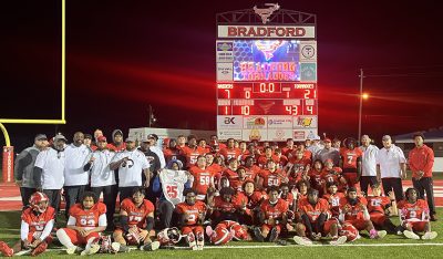 The Tornadoes overcame a holding penalty on their second possession of the half when Santa Fe was penalized for a personal foul. Kennedy had an 11-yard run to give Bradford a first down at its own 47 before Chase Phillips gained 41 yards on a pass reception, giving the Tornadoes a first down at the Santa Fe 12. Kennedy was dropped for a 1-yard loss on the next play, but Cubbedge then hooked up with Nixon in the corner of the end zone for the second time in the game for a 13-yard touchdown with 1:07 remaining in the third quarter. Sapp’s PAT ended the scoring at 21-7.