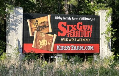 At press time, the Lawtey billboard promoted the Kirby Family Farm’s Six Gun Territory Wild West Weekend.