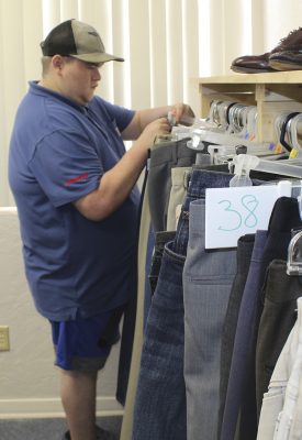 The clothes closet is open on Tuesdays from 1 p.m. to 4 p.m. Transition Academy students Elijah Alexander, Summer Crews and Tyler Williams are taken to the church at 10 a.m. every Tuesday and work before the clothes closet opens to the public. (Student Sai Ruiz also helped before moving out of the state.) Gault said students separate hangers and hang clothing up.