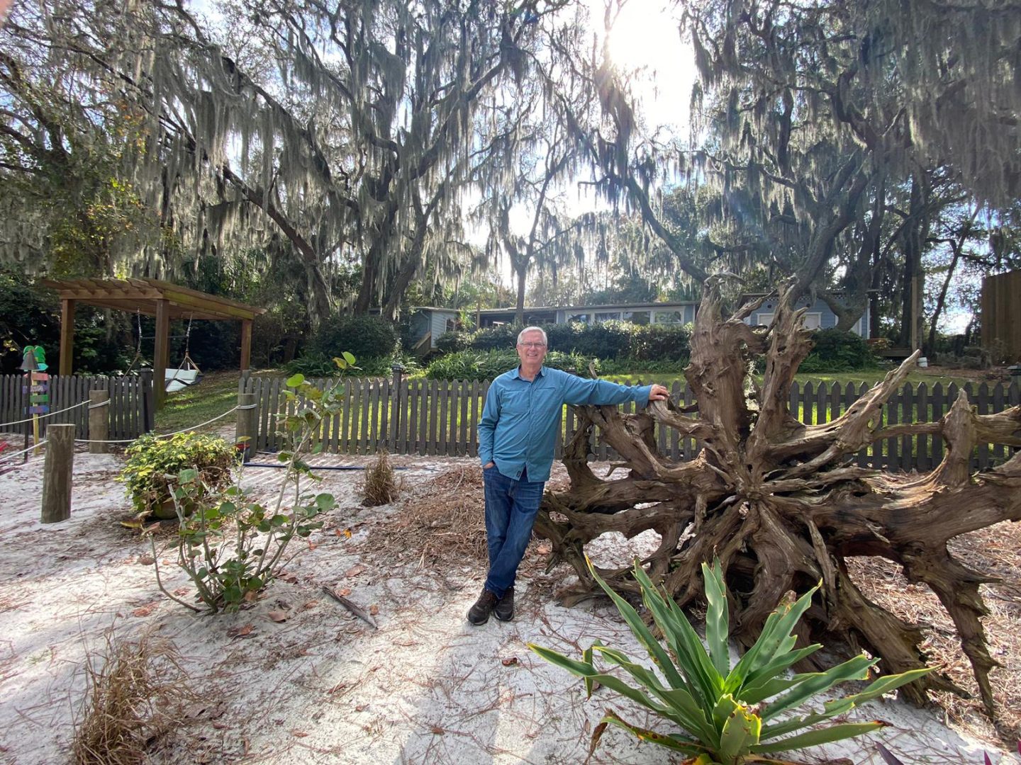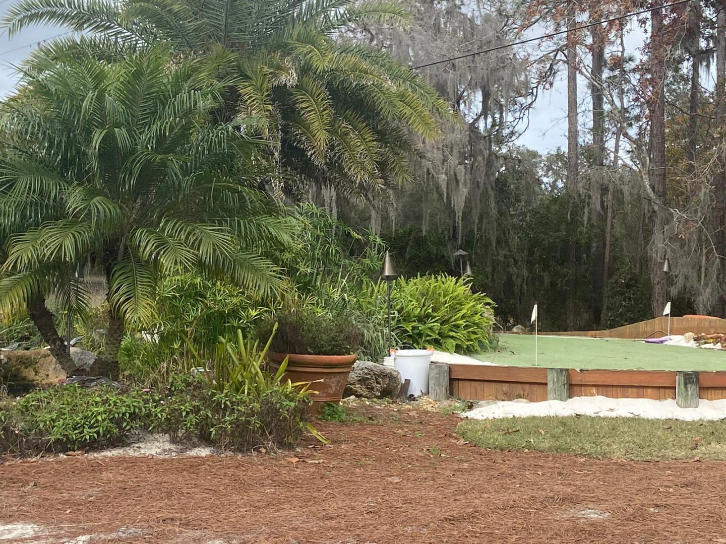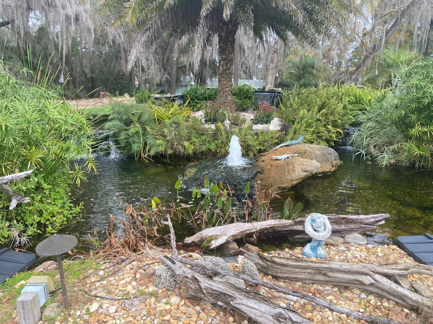 But it doesn’t stop there! Buck drove us around to the backyard in his golf cart to see an amazing tropical island open up right there in his backyard. That is when Ginny was speechless! What is there to say when you are standing in the middle of a tropical island complete with a 20-foot Bird of Paradise, Sea Grapes, varying types of palm trees, Hawaiian Ti plant, huge rocks, a monster-sized piece of driftwood, beautiful sand, a boat ramp going out to a small island, and beautiful Crystal Lake as the backdrop. They call it the Palm Tree Paradise. Need we say more?