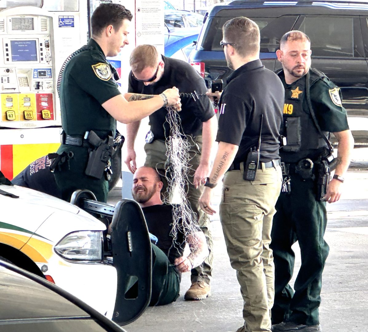 “Apparently, there was some sort of disturbance that was going on inside the store with this gentleman,” he said, referring to a suspect in the back of a patrol car. “The deputy walked in on it, and apparently, a civilian was actually trying to control the—just an unrelated civilian that just happened to be in the store, tried to control the situation. The deputy walked in on it, and then (the suspect) started fighting both deputies and the civilian.”