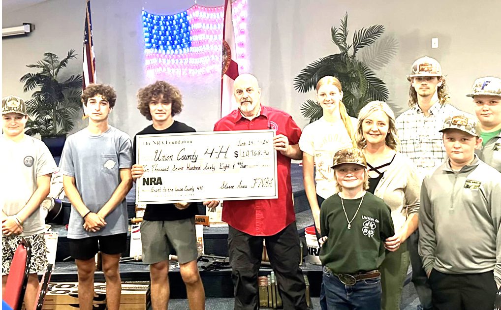 Dallen Cox receiving 3rd place in the State Shotgun Competition .Meagan Daniel with Table Setting Contest Winner, Sawyer Dyal.4-H members visited Judge Mitchell Bishop when learning about citizenship at Camp USA. Front L to R: Eli Barry, London Halle, Tripp Pittman. Row 2: Sawyer Dyal, Shaw Daniel, Ruby Hunter, and Wayne Hartley. Row 3: Travis Hunter, McKenzie Barry, Ryker Sellers, Atticus Allen, Lola Allen, Kamryn Hartley, Raylan Dyal,, and Lane HartleyMeagan Daniel (Center) teaching sewing to 4-Hers L to R Charley Williams, Shaw Daniel, Sybil Thomas, Raylan Dyal, Lyle Neuhofer, and June Brooks.Ryker Sellers, Ramsay Kay Wallace, Rylan Boyette, and Cadence Duniven at the Union County 4-H End of the Year Awards Banquet.Meagan Daniel (Center) teaching sewing to 4-Hers L to R Charley Williams, Shaw Daniel, Sybil Thomas, Raylan Dyal, Lyle Neuhofer, and June Brooks.Mike Weeks of the Friends of NRA presented a check to Union County 4-H Shotgun Club. L to R: Rylen Cox, Dallen Cox, Cole Austin, Mike Weeks, Celia Elixson, Shaw Daniel, Meagan Daniel, Quienten Elixson, Weston Daniel, and Jenson Tetstone.Kallie and Kassie Kadlec at Camp Timpoochee Marine Science Camp in Niceville.Lyle Neuhofer and Shaw Daniel presenting at District V 4-H Events .Kylee Thomas singing in the Share the Fun competition at District V 4-H Events.4-H Warm Up Goat Show 2024 with Kallie Kadlec and Weston Daniel.4-H members Hudson and Hagen Thomas with their parents and the judge at the 2024 Swine Show4-H State Horse Judging Contest 3rd place: Maddie Croft, Cailynn Boggs, Cadence Collins, and Cuyler Collins.4-H Warm Up Goat Show 2024 with members Jolene Moore , judge Hunter Williams, and Grace Box.Everett Emery showing his pig at the 2024 Union County Livestock Association ShowCloverbuds Joy Del Howard and Jepson Howard fishing at their club meeting.Weston Daniel learning about marine science at the Cedar Key Nature Coast Biological Station.Members at Camp Timpoochee 4-H Marine Science Camp in Niceville, FL: L to R: Weston Daniel, Logan Miller, Shaw Daniel, Kullen Kadlec, Lane Hartley, Landon Douglass, Anderson Griffis, and Raylan Dyal.Braxton Johnson competing at District V 4-H Events.Members Rylan and Emma Boyette picking blueberries at the 4-H Adventures in Ag day camp.Tripp Pittman learning about healthy living through our 4-H blender bike. Patrick Gillen and Mckenzie Barry watching.4-H Aviation Day Camp at the Gainesville Airport: L to R- Caroline Moore, Klayton Neuhofer, Brantley Moore, Weston Daniel Raylan Dyal, Shaw Daniel, Ryker Sellers, Hudson Parrish, Tucker Reid, Kallie Kadlec, Raylan Dyal, Peyton Kilgore, Hannah Rizer, and Meagan Daniel.Cayton and Layla Yeauger at the 2024 UCHS Homecoming Parade on the 4-H Float- Lights, Camera, 4-H: Leading Tomorrow’s Stars.4-H Agent Meagan Daniel with Weston Daniel loading and delivering supplies to Steinhatchee for Hurricane Helene victims