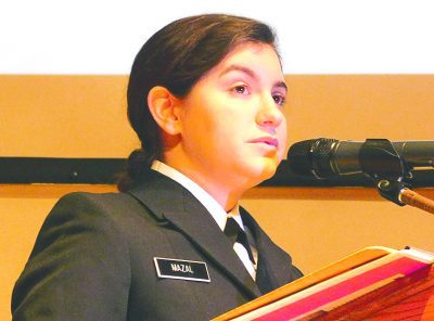 The guest speaker, a native of Lake Butler, Lieutenant Junior Grade (LTJG) Kamil A. Mazal was introduced by Commander Christopher Alvarez, Tiger Battalion Commander in Union County JROTC. Mazal graduated Union County High school in May 2014 as Salutatorian of her class. In July of the same year she reported to the United States Naval academy (USNA) representing Congressman Ted Yoho (F-13). Mazal graduated from the USNA on May 25, 2018 earning her officers commission and a Bachelor of Science in Political Science with an emphasis in international relations and a language minor. In Feb. 2019 she began flight school at Naval Air Station Pensacola. Having completed Initial Flight Screening (IFS) in April she began Aviation Preflight Indoctrination (API). Graduating in May, Mazal reported to Milton Fl. for Primary Flight Training (PFT) with training squadron 3 (VT-3). Completing PFT in June 2020 she reported to Corpus Christie, Texas for multi- engine Aviation Training in the T-44 King Air with training squadron 31 (VT-31) in July. Upon completion of multi-engine training in March 2021 LTJG Mazal reported to Kingsville TX for jet training in the T-45 Goshawk. She must complete this last phase of training before she can earn her wings of gold.