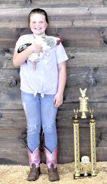 Audry Frank with her Grand Champion Columbian Plymouth Rock rooster, which she both raised and showed.