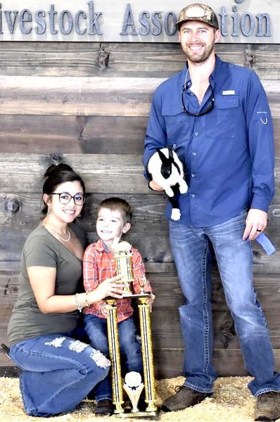 Dallas Williams, who raised and showed the Grand Champion Dutch doe, with his parents Grace and Jordan Williams.