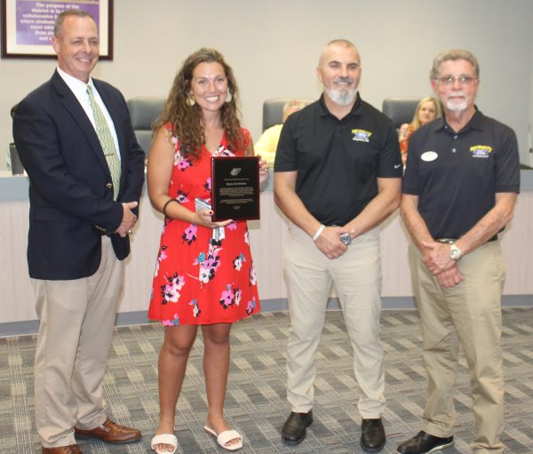 Superintendent Mike Ripplinger presented the company’s representatives, Amir Asadi, David Green, and Savannah Murray, with a plaque expressing the district’s appreciation for the dealer’s support.
