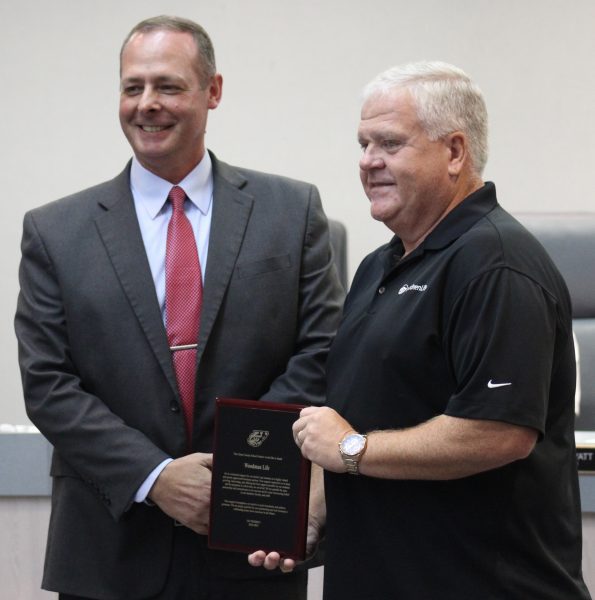 Union County Schools Superintendent Mike Ripplinger recognized Brad Elixson of Woodman Life during the school board’s Tuesday, August 27 meeting.