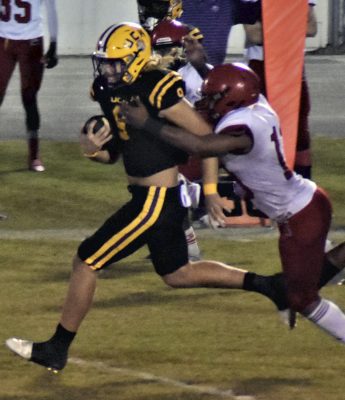 Quarterback A.J. Cortese (left) shakes off a defender on the way to an 80-yard touchdown in the first quarter. Photo by Lisa Holtzendorf.