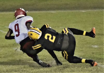 Markus Strong (right) sacks Lafayette quarterback Tywan Williamson. Photo by Lisa Holtzendorf.