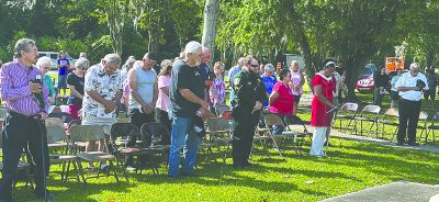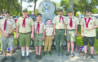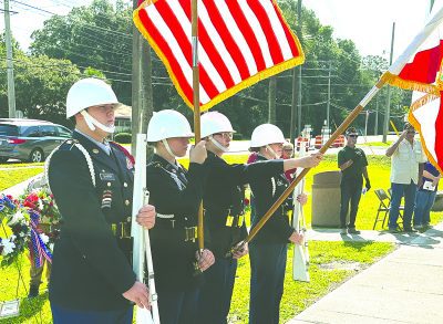 The ceremony included the participation of JROTC cadets, Sheriff’s Explorers and Scouts, as well as Post 56’s commander, Norman Dowdy, vice commander, Raymond Hunt, sergeant at arms, Artis Rix, and chaplain, Hank Williams. Handmade wreaths by the Jackson family and donated by the Downtown Merchants were placed at the memorial. County Commissioner Carolyn Spooner spoke and offered a wreath on behalf of the county commission. Other wreaths represented the American Legion, VFW, Boy Scout Troop 70, Daughters of the American Revolution, Downtown Merchants Association, North Florida Regional Chamber of Commerce, Starke City Clerk Jimmy Crosby, city of Starke, Woman’s Club of Starke, Bradford County and Tourist Development Council.