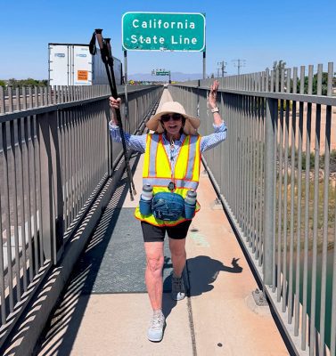 “I’ve started carrying dog biscuits in my pocket,” Benjamin said. “I also have walking sticks. At one point in Arizona, when I had a bunch of (dogs) surround me, I just beat the sticks together — metal sticks — and went in a circle. They looked at me like, ‘This lady’s crazy. We’re not going to bother her.”
