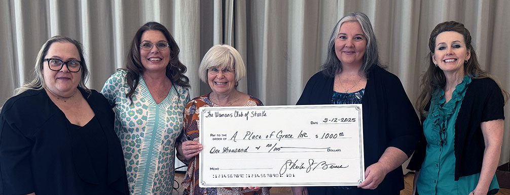 With St. Patrick’s Day occurring in March, the Woman’s Club of Starke celebrated Irish culture at its monthly meeting, serving up a traditional menu of shepherd’s pie, Irish flag salad, soda bread and Irish apple cake. Club members enjoyed a presentation by Amy Polk, owner of Hometown Grounds Coffee Company, followed by the club making a $1,000 donation to A Place of Grace Inc., a local nonprofit that helps feed the disadvantaged. The Porchiazzo family provides a meal to anyone in need every day at 1 p.m. at the Rags to Riches thrift store. The community has come together to help provide these meals, with local churches and individuals helping prepare and serve the food. Pictured (l-r) are Arts and Culture Co-Chair Lorie Riley, President Sheila Barnes, Third Vice President Cleo Elder, Crystal Porchiazzo and First Vice President Cindy Little.